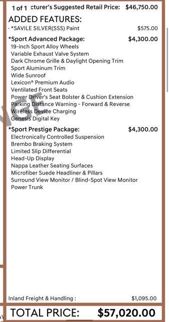 Savile Silver 2023 Genesis G70 3.3T Sport Prestige / Advanced package 4D Sedan AWD 8-Speed Automatic with SHIFTRONIC 3.3L V6 DGI DOHC 24V 17/26 City/Highway MPG
