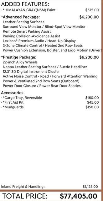 ABS brakes, Active Cruise Control, Alloy wheels, Compass, Electronic Stability Control, Front dual zone A/C, Heated & Ventilated Front Bucket Seats, Heated door mirrors, Heated front seats, Illuminated entry, Low tire pressure warning, Power Liftgate, Power moonroof, Remote keyless entry, Traction control.
