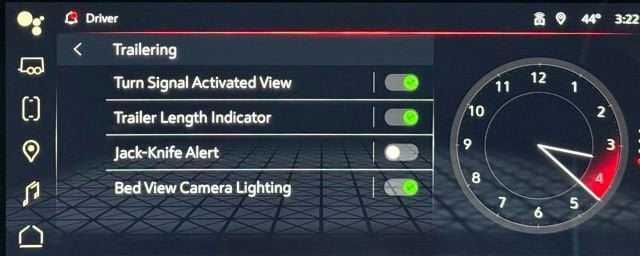 - Allows driver to see inside the cargo bed on the infotainment display to help with 5th wheel or gooseneck hitching and to check cargo